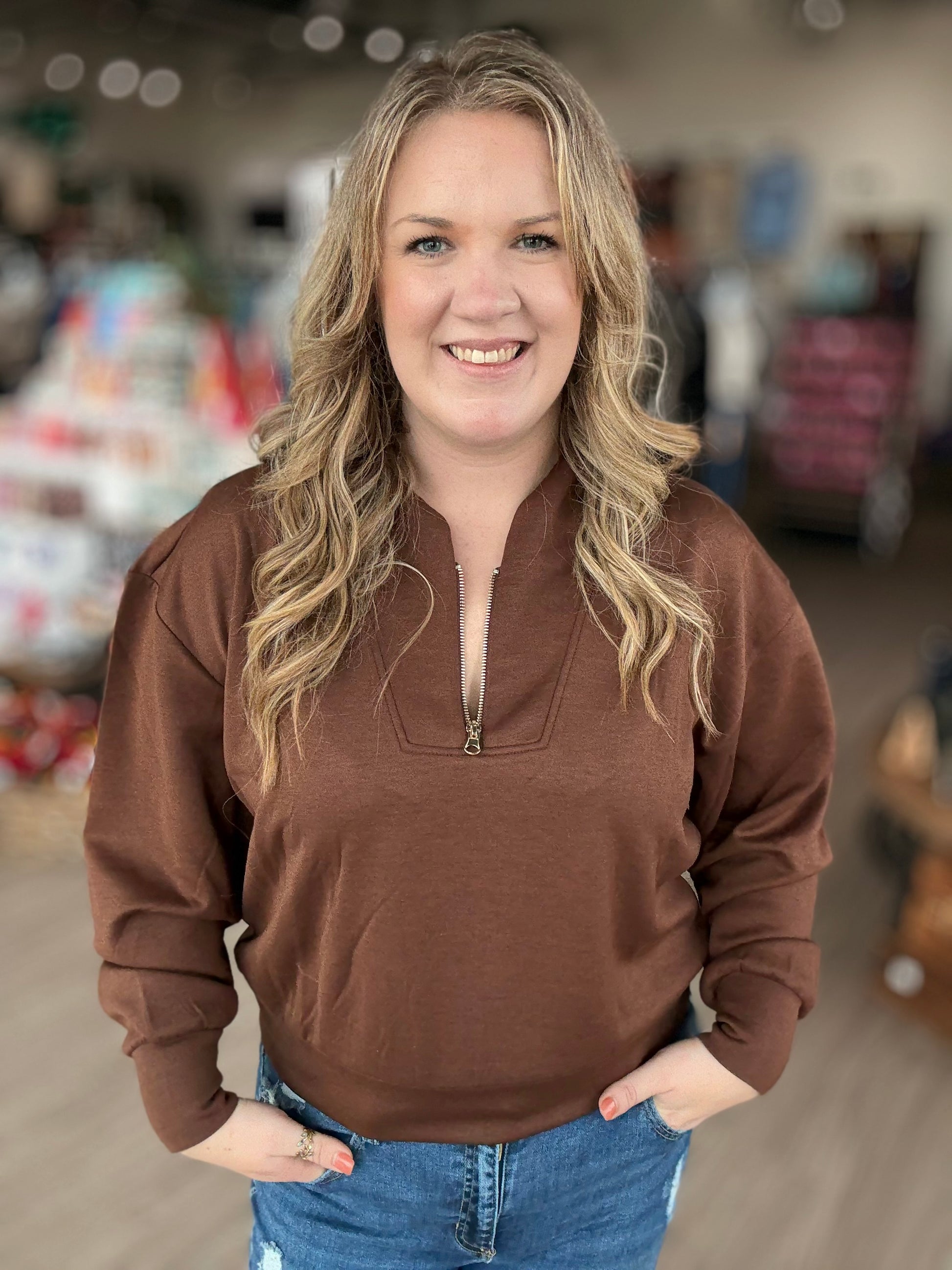 Get cozy and stylish this Black Friday with our brown Scuba Zip! Made from a unique scuba material, this quarter zip provides warmth and comfort while standing out in a crowd. Stay on trend with this must-have piece!