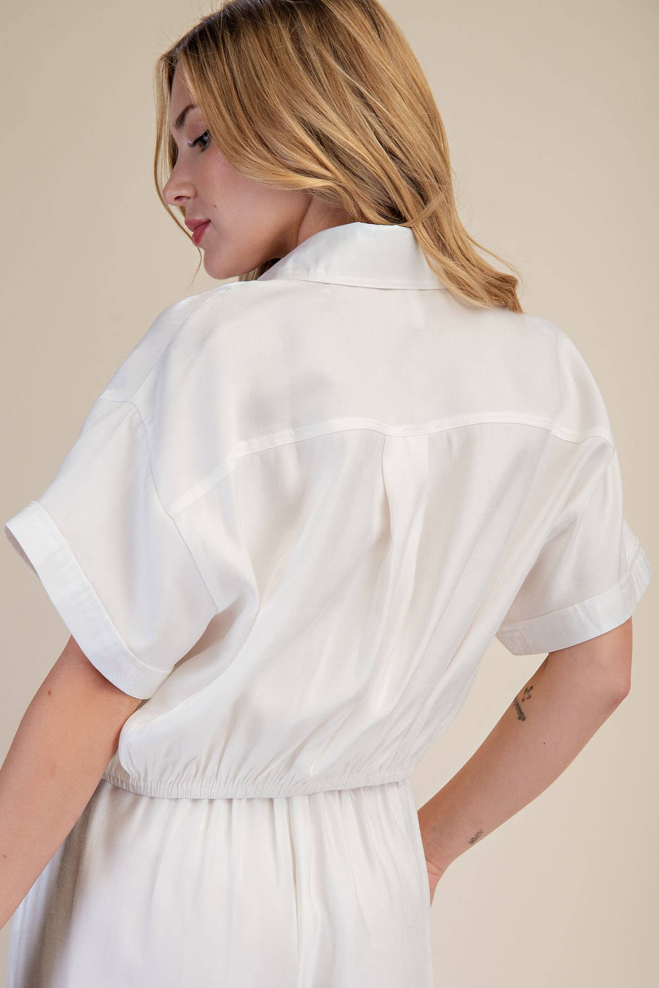 Get ready to add some style to your wardrobe with our White Collar Short-Sleeve Crop Shirt. With a unique collar neck and trendy crop cut, this shirt is perfect for any occasion. Don't settle for dull basics, stand out with this playful and fun addition to your closet.