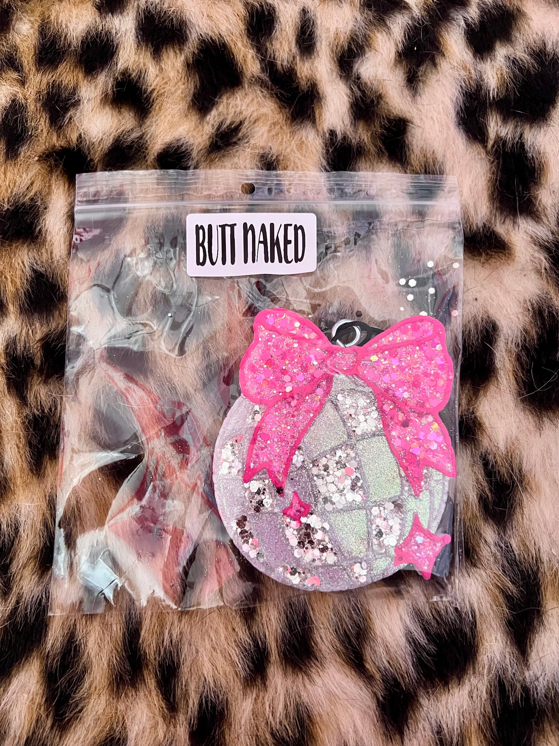 Add a little flair to your car with Disco W Bow Car Freshie! This funky freshie keeps your car smelling great and adds a touch of personality to your ride. Say goodbye to boring car air fresheners and hello to some disco vibes. Groovy, baby!