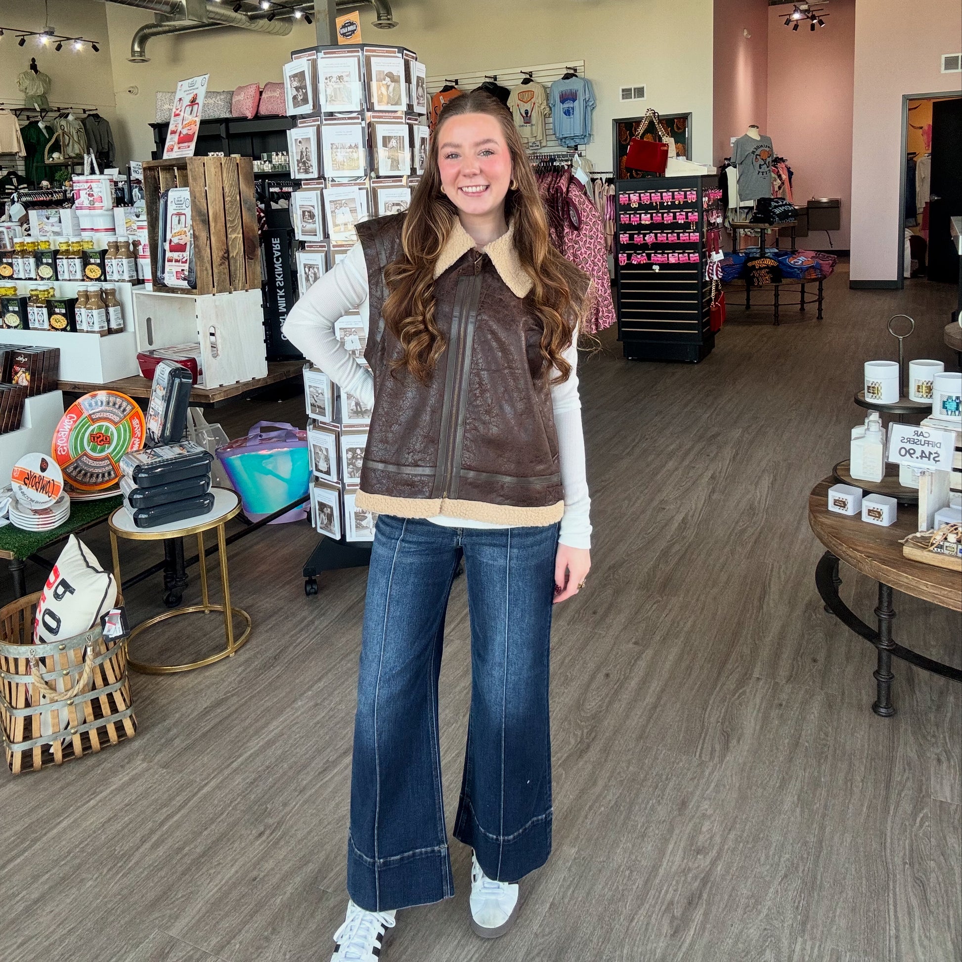 Zip up in style and comfort with our Leather & Sherpa Vest. This faux leather collared vest features buckle details and convenient pockets, perfect for any adventure. Lined with sherpa for extra warmth.