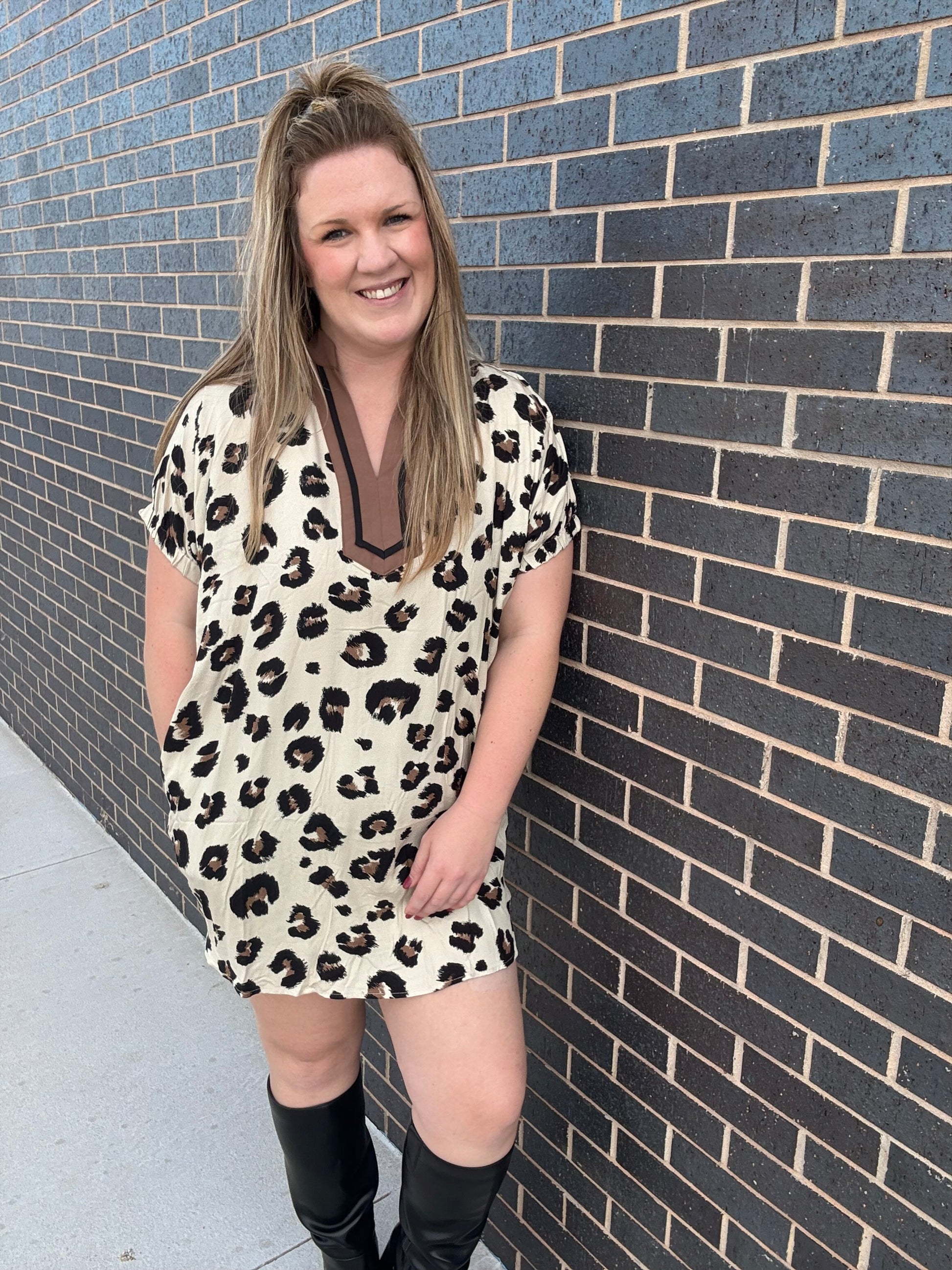 This playful mini dress turns heads with its oversized leopard print and swaggy dolman sleeves for effortless style and comfort. The contrast inset binding around the neck adds a fun twist, while the lightweight woven fabric keeps you feeling cool and confident. Fully lined and non-sheer, it’s perfect for standout looks that don’t hold back.