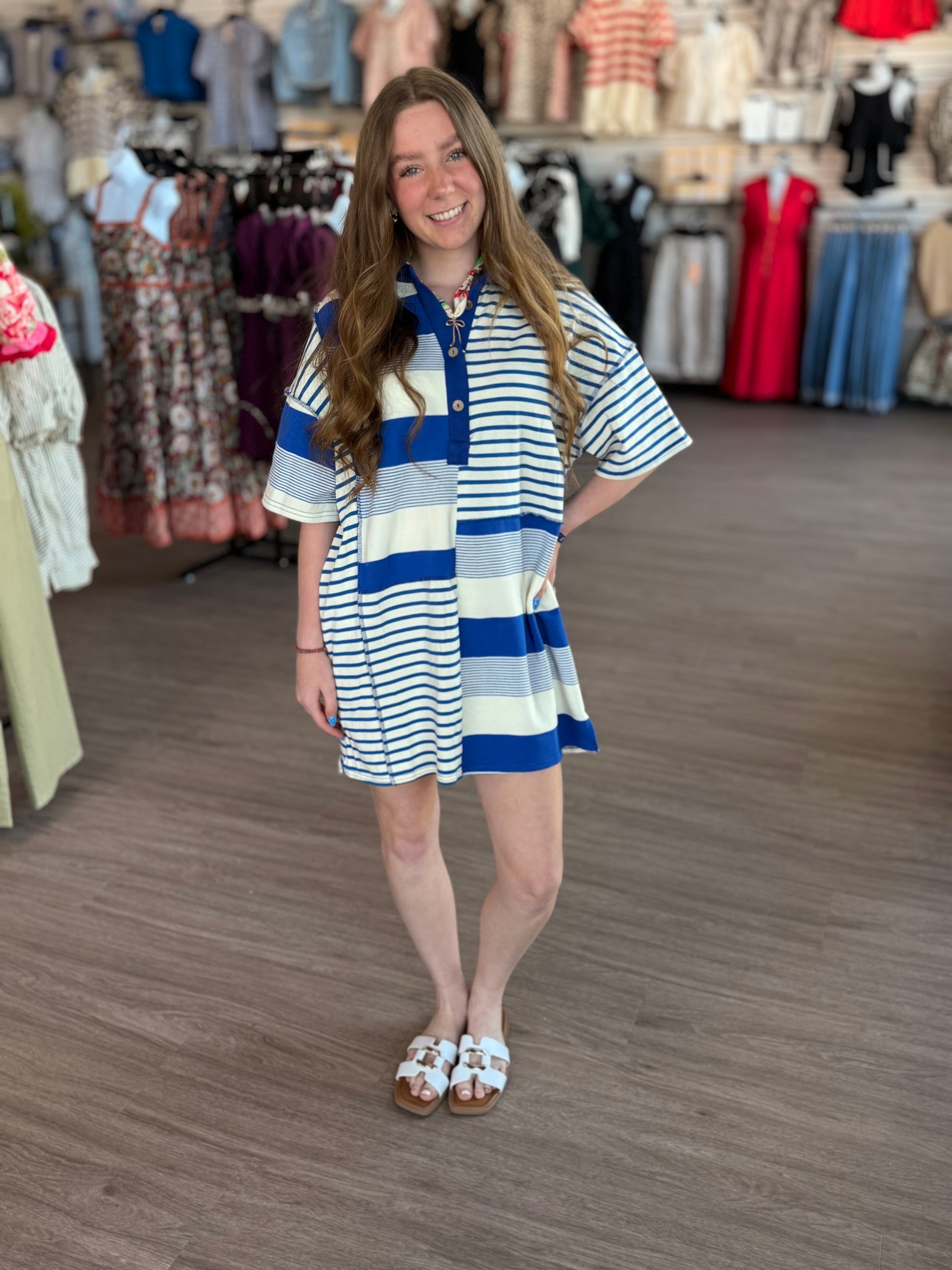 Step into effortless style with the Multi Blue Stripe T-shirt Dress. Its vibrant blue stripes add a fun pop of color, while the soft, breathable fabric keeps you comfy all day long. Perfect for casual outings or relaxed weekends, this dress combines playful charm with easygoing comfort. Dress it up with sneakers or sandals for a look that’s as lively as you are!