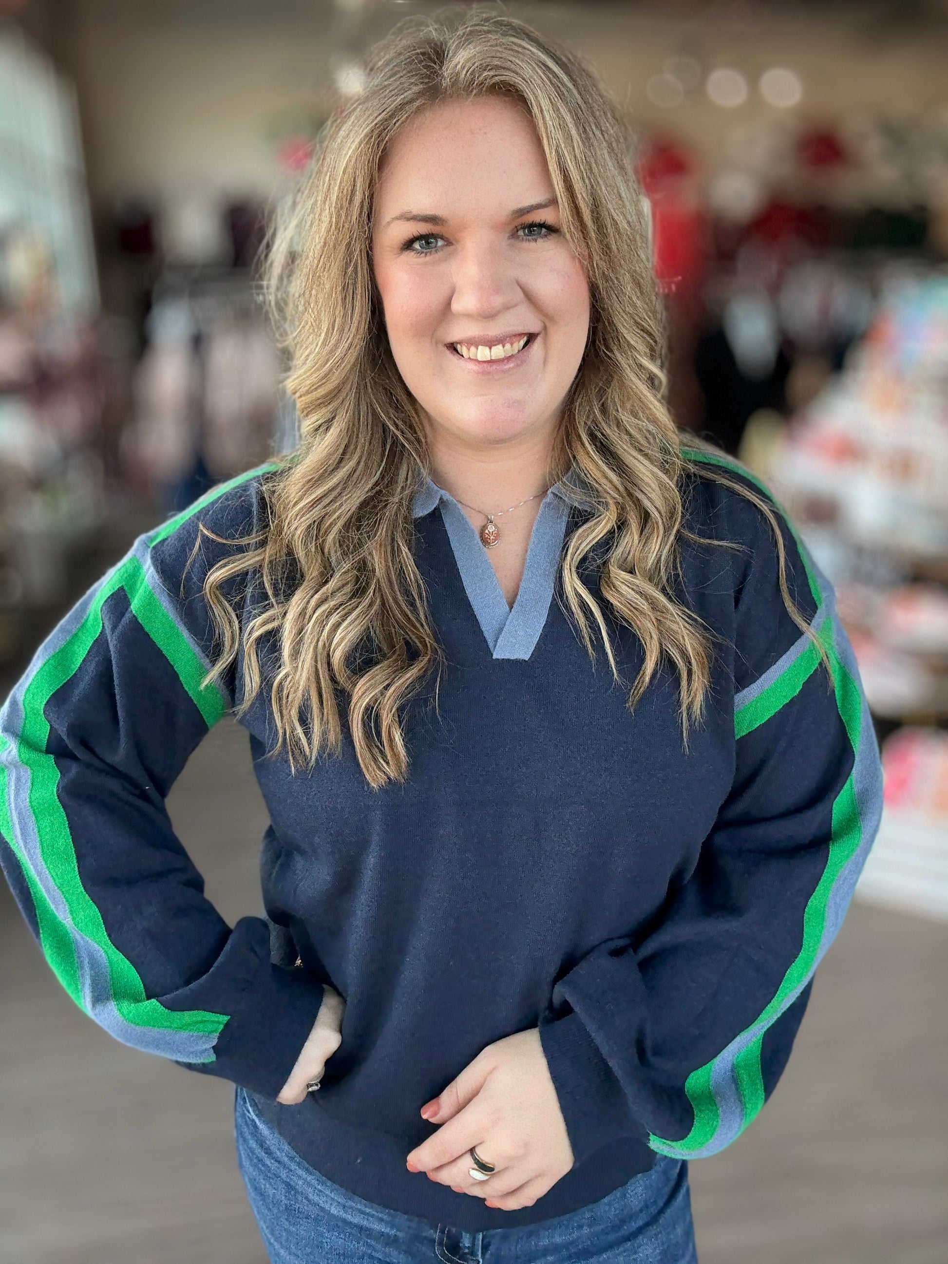 Expertly crafted with a stylish navy and green striped design, this top is perfect for any occasion. The sleeves feature a unique downward stripe pattern, adding a touch of sophistication and elegance to your outfit. Made with high-quality materials, this top is both comfortable and fashionable.