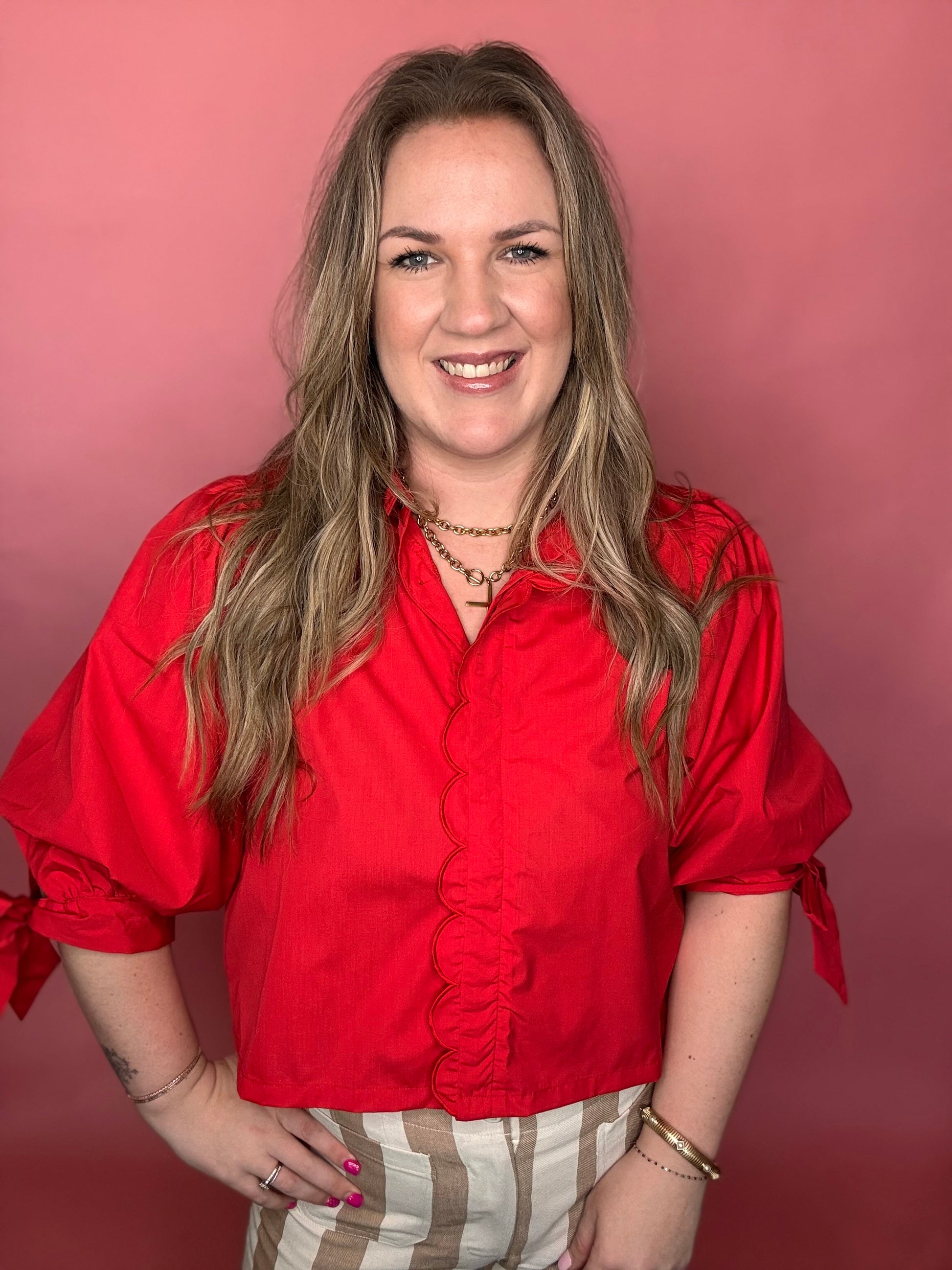 Brighten your wardrobe with this cheerful tomato red blouse, where delicate scallop detailing frames the buttons for an unexpected touch of charm. Tie sleeves add a flirty, adjustable fit that lets you show off your style—cinch them snug or let them flow loose. Perfect for layering over basics or wearing solo, this piece brings personality and polish to any outfit.